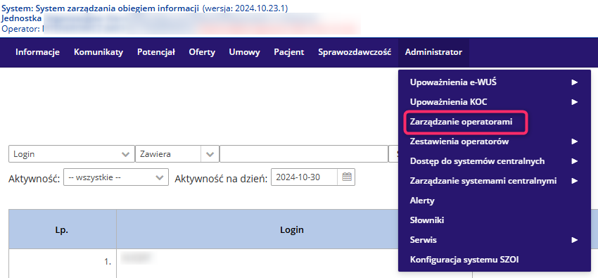 Po poprawnym zalogowaniu należy przejść do sekcji Administrator> Zarządzanie operatorami