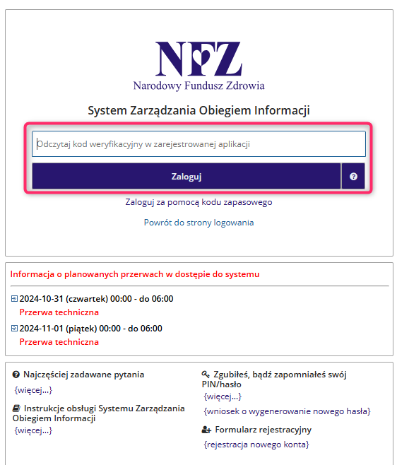 Po poprawnym logowaniu należy użyć kodu autoryzacyjnego do logowania, i nacisnąć "zatwierdź"