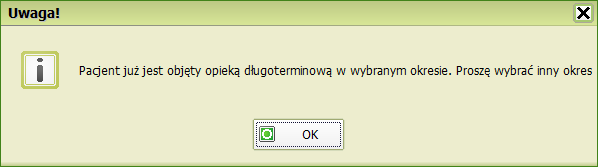 Przy kolejnym wprowadzaniu zabiegów przez książkę przyjęć, program sam sprawdzi czy wybrany pacjent został już objęty opieką długoterminową.